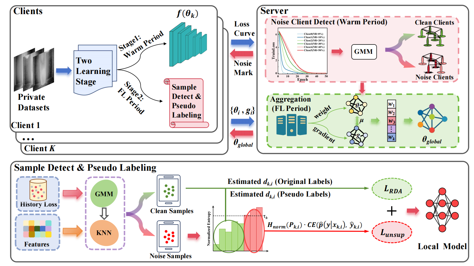 指静脉识别作为一种高安全的生物特征认证技术,在金融支付、智能门禁等领域具有显著优势。然而,在日益普及的联邦学习(Federated Learning, FL)分布式部署环境中,由于各客户端数据采集环境的差异、用户注册质量波动以及隐私保护下的数据标签不确定性,导致系统极易产生标签噪声,严重威胁了指静脉识别的准确性和可靠性。针对上述挑战,作者创新性地提出了FedRDA框架(图1),通过三层渐进机制实现端到端优化。首先,构建分层噪声检测系统,从客户端和样本两个层面精准识别标签噪声。其次,设计动态伪标签学习模块,采用改进的自适应标签模糊化损失函数,动态调整样本学习难度参数并融合动量更新机制,同时整合预测不确定性熵与无监督一致性约束,实现精准的标签修正。最后,提出基于距离感知和梯度一致性度量的自适应聚合策略,有效应对分布式环境中的数据隔离和噪声传播问题。