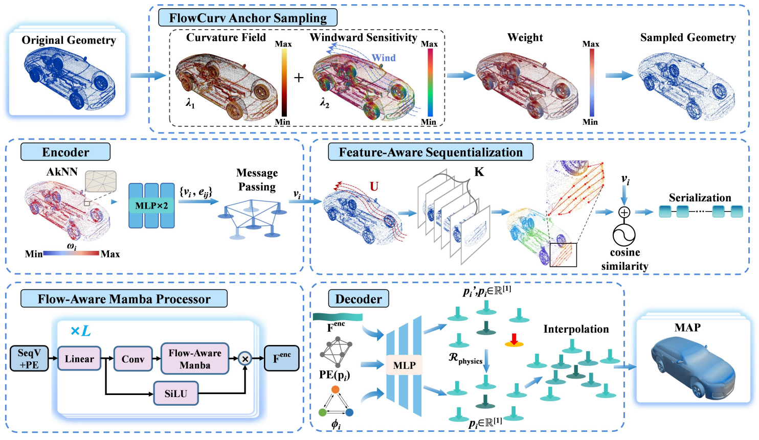 在现代汽车设计中,大规模三维车辆空气动力学预测仍面临严峻的计算挑战。针对传统计算流体力学方法仿真耗时过长,以及现有学习模型在密集网格处理中易陷入高计算复杂度和拓扑信息丢失等问题,作者创新性提出了一种名为FCMO的物理感知神经算子。FCMO集成了流体力学原理和选择性状态空间模型,由四个相互协同的核心组件构成。首先,FlowCurv锚点采样策略依据归一化局部曲率与迎风敏感度自适应选择关键网格节点,从而在保持物理一致性的同时减少冗余点;其次,双尺度物理感知位置编码采用特征引导的蛇形扫描机制,将三维不规则网格映射为保持因果关系的序列表示;在此基础上,模型核心—流感知Mamba处理器能够依据壁面距离及局部流动特征动态调整状态转移,实现高效的跨尺度信息交互;最后,物理约束解码器通过混合加权插值机制显式强化守恒定律的约束,确保预测结果的物理合理性。在Ahmed-Body和DrivAerNet基准上的大量实验证明,FCMO在表面压力预测、壁面剪切应力估算和阻力系数准确性方面均取得了业界顶尖的性能,同时以更少的计算量和内存使用量展现了卓越的计算效率。